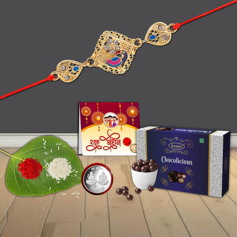 • Roli Chawal: Traditional elements of Roli and Chawal packed in elegant containers for the auspicious Rakhi ceremony.