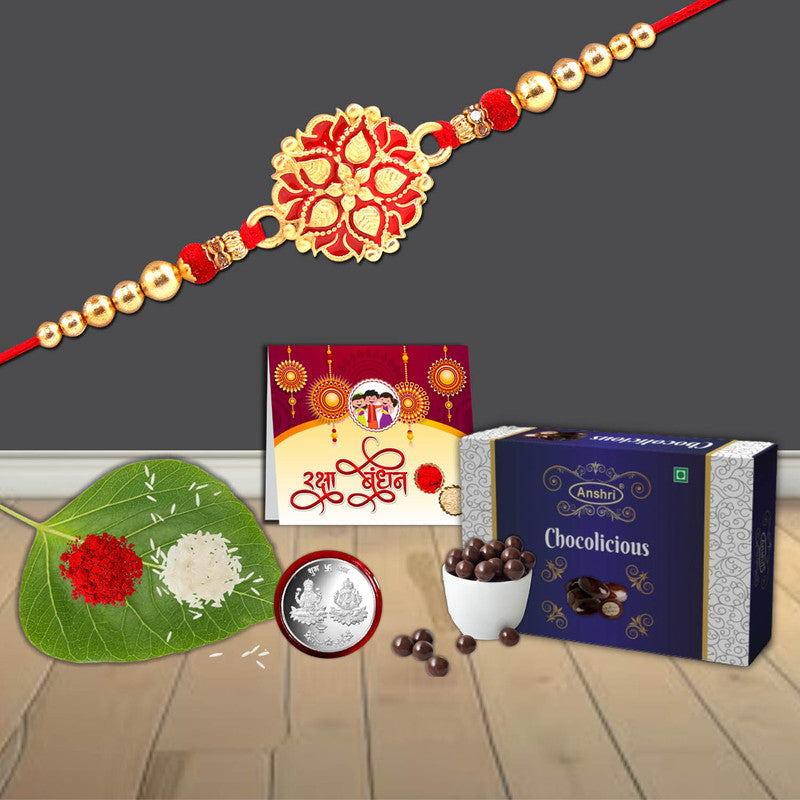 Rakhi for Brother: A stunning Rakhi designed with care, featuring traditional patterns and vibrant colors, symbolizing the love and protection between siblings.