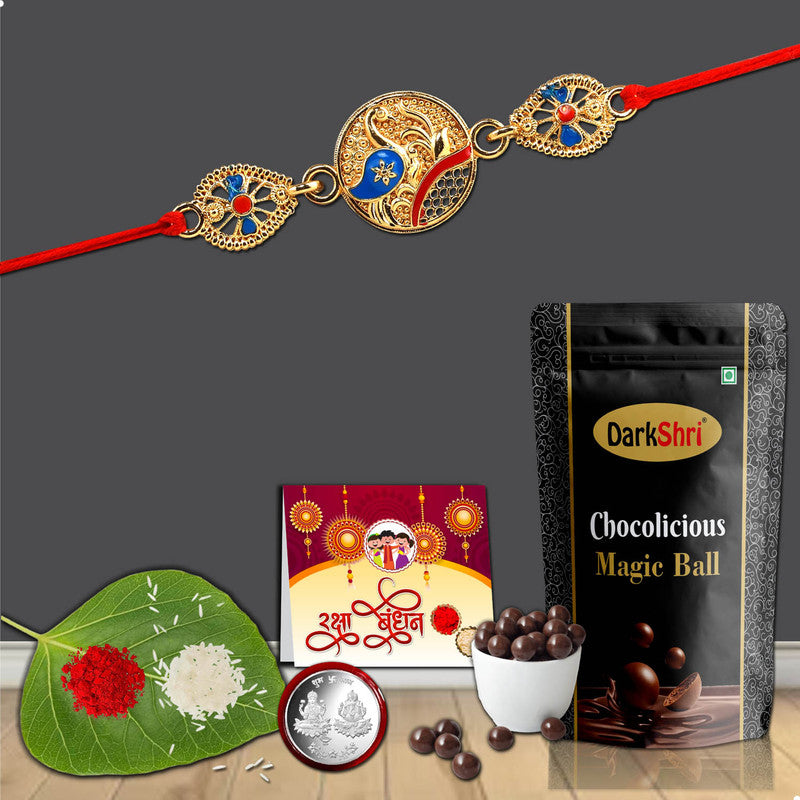 Rakhi for Brother: A stunning Rakhi designed with care, featuring traditional patterns and vibrant colors, symbolizing the love and protection between siblings.