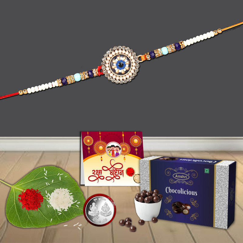 Rakhi for Brother: A stunning Rakhi designed with care, featuring traditional patterns and vibrant colors, symbolizing the love and protection between siblings.
